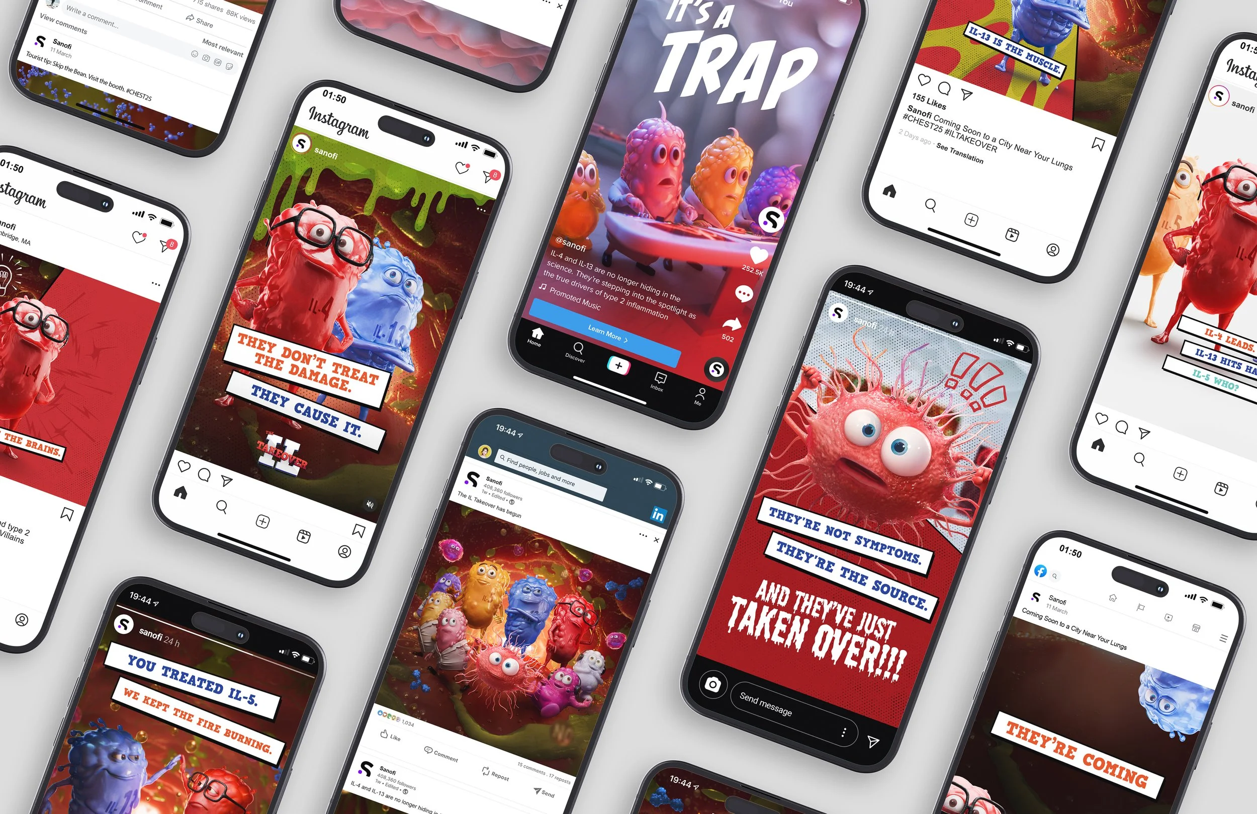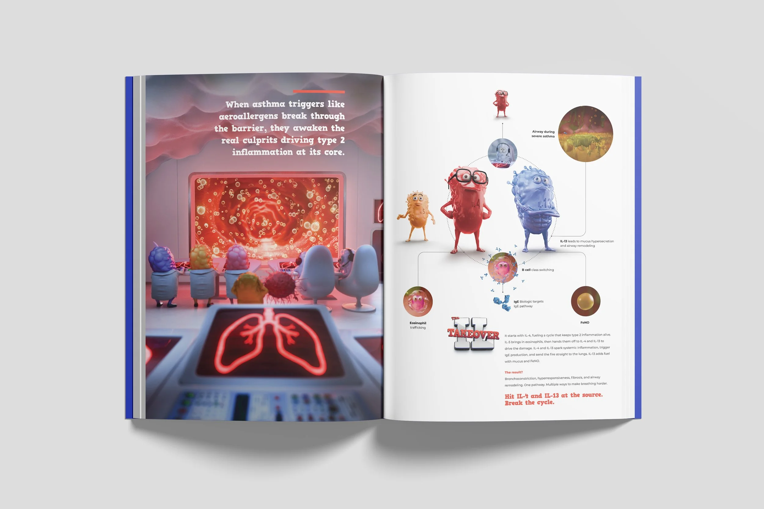 The design of the IL Takeover characters was built with intention and edge, using the language of graphic novels to turn complex science into bold visual storytelling. Every silhouette, color choice, and composition was crafted to reflect their molecular role and villainous persona. IL-4 is sharp and strategic. IL-13 is heavy and explosive. From motion to print, the visual system holds strong with clean layouts, striking hierarchy, and a style that brings scientific clarity to life with impact and attitude.